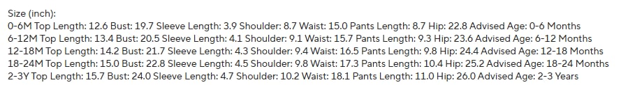 Sizes: 0-6M, 6-12M, 12-18M, 18-24M, 2-3YĀ