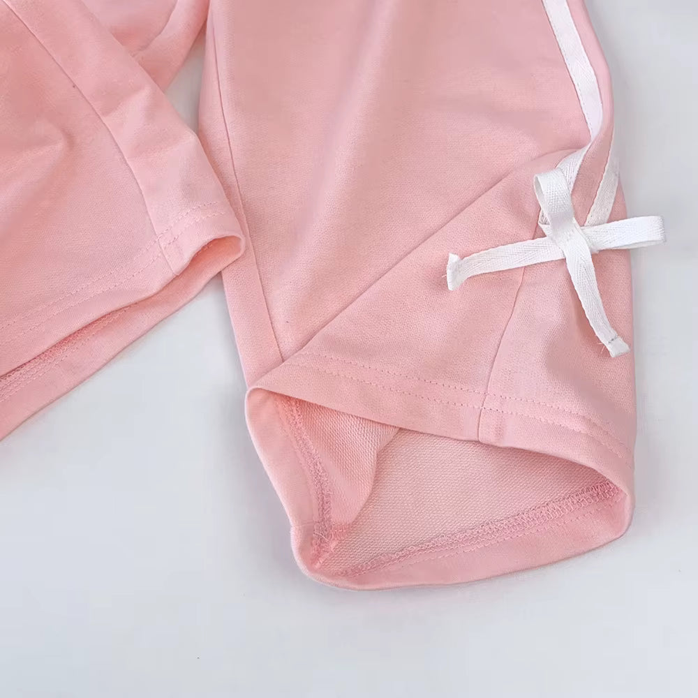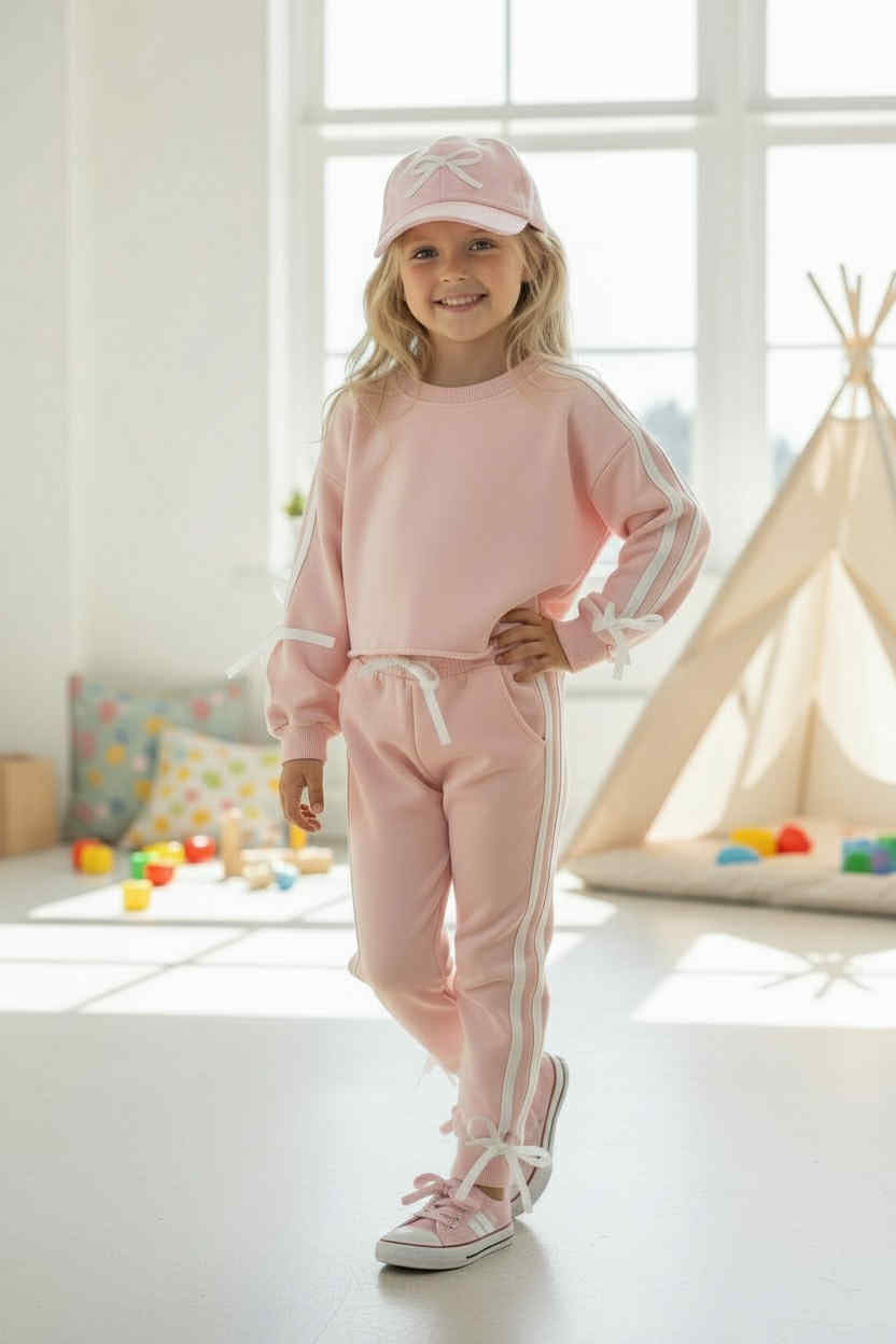 Get ready for adorable style with this two-piece track set designed for the little ones! Featuring charming bows on both the sleeves and pant legs, this set brings fun flair to everyday wear. Crafted from a comfortable cotton and polyester blend, it's soft enough for all-day play while holding up to active adventures. Perfect for kids who love a touch of personality in their wardrobe.Â