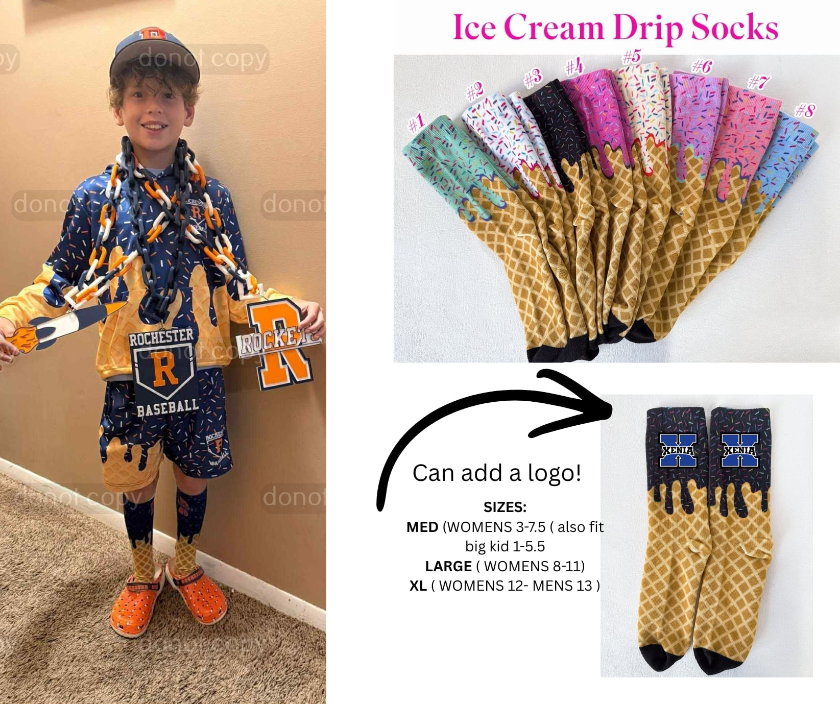 Scoop up the hottest sock trend! These ice cream drip socks trending everywhere with their bold, eye-catching design. Want to make them extra special? Add your own custom logo and transform them into the ultimate branded merch or personal statement piece. Perfect for anyone who loves standing out! Playful, comfy, and totally customizable—these socks are about to become your new obsession!