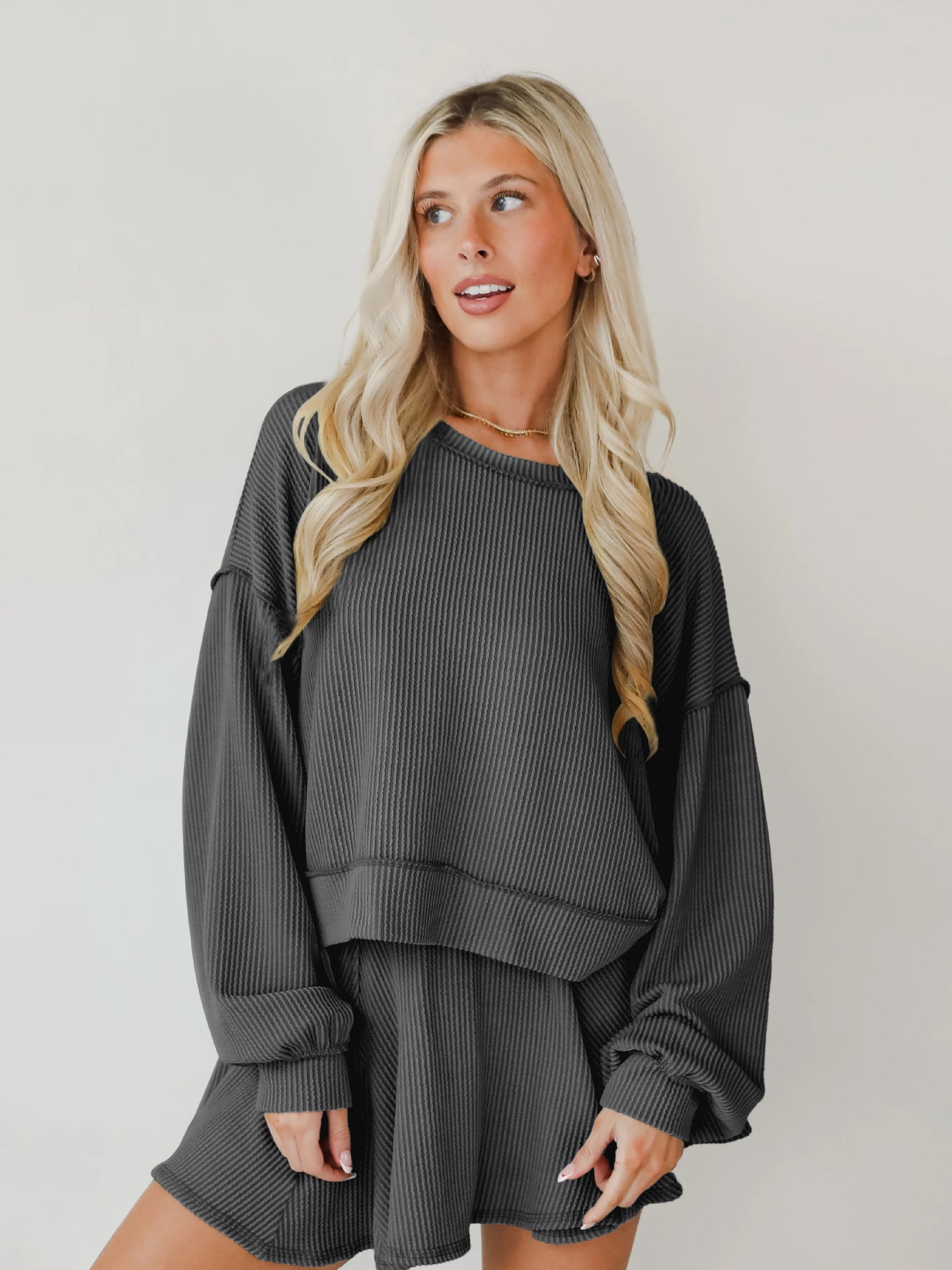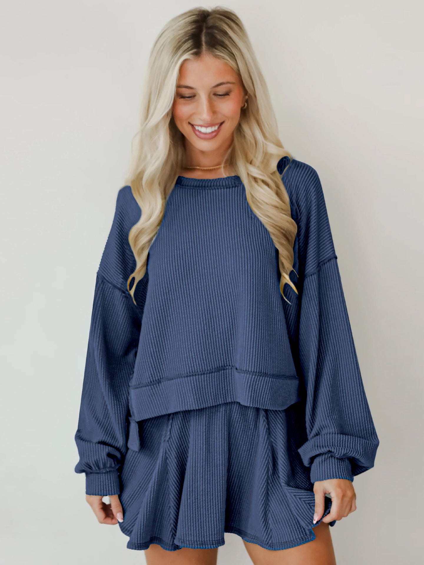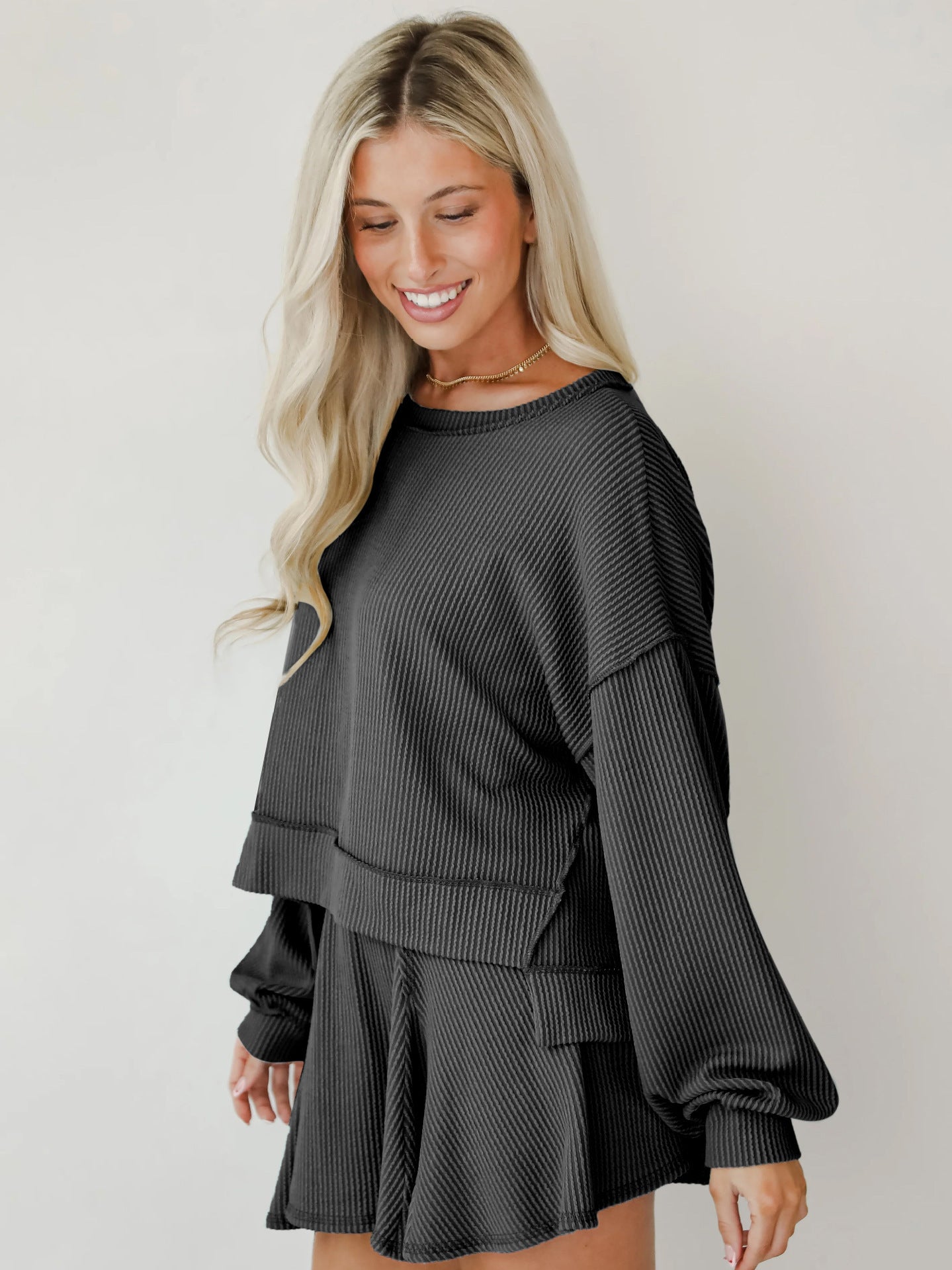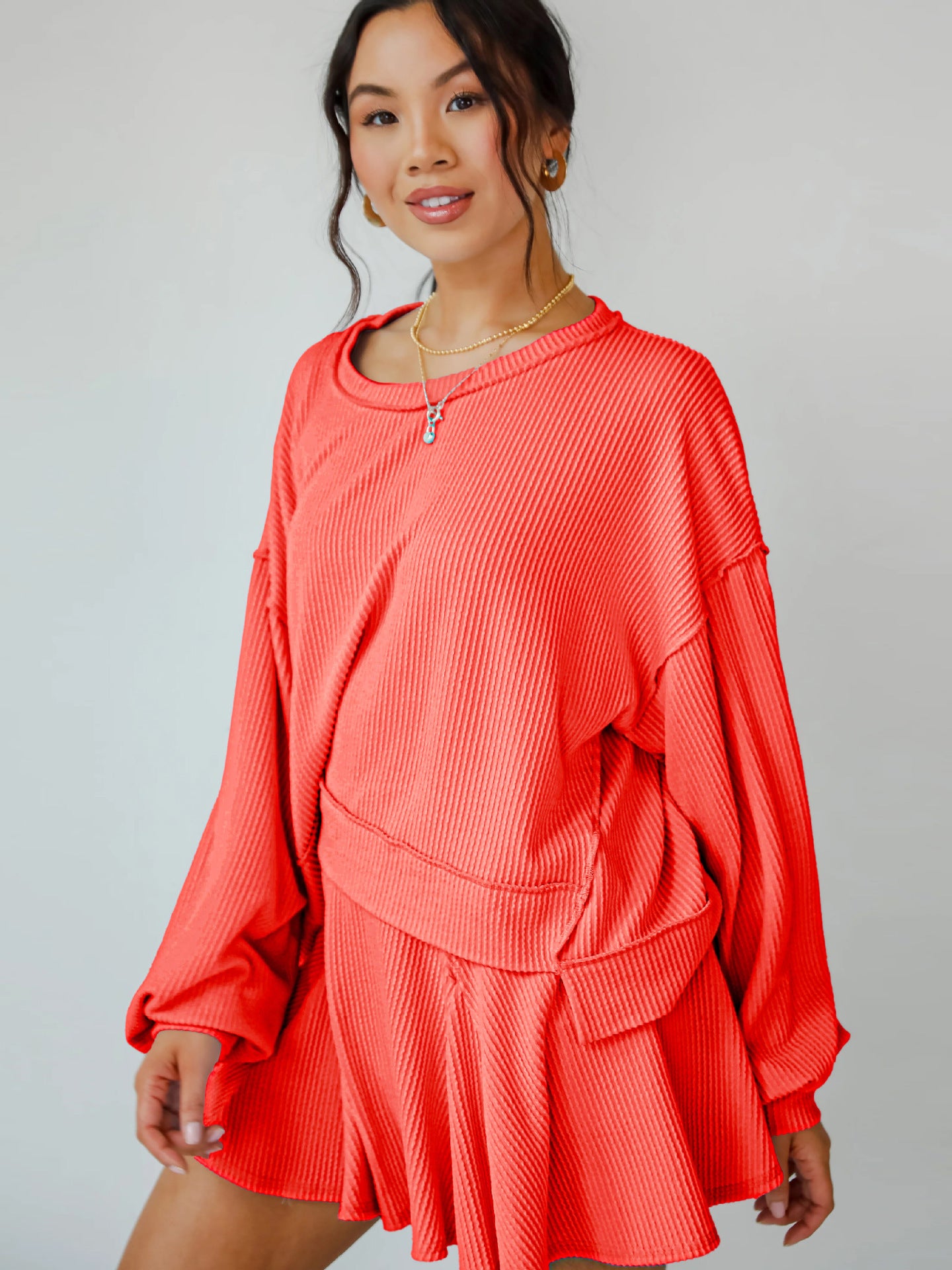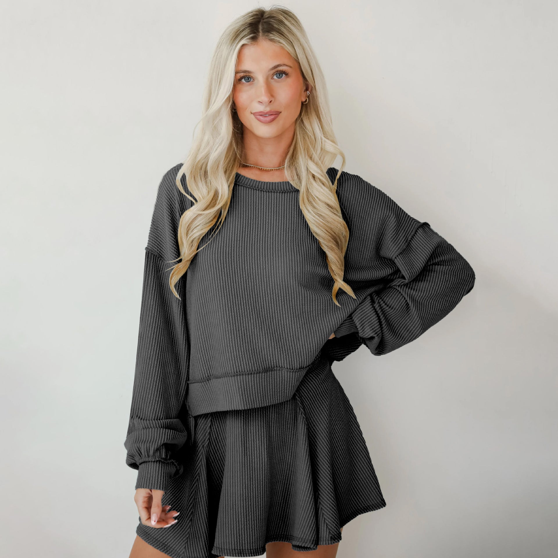 Rock an effortlessly cool vibe with this two-piece set that's giving main character energy. The baggie ribbed top features long cuffed sleeves and an asymmetrical cut—longer in the back for that coveted high-low silhouette—while the crew neckline keeps things casual and chic. Pair it with the matching short skirt for an outfit that's equal parts cozy and fashion-forward. Perfect for anyone who loves oversized comfort without sacrificing style.