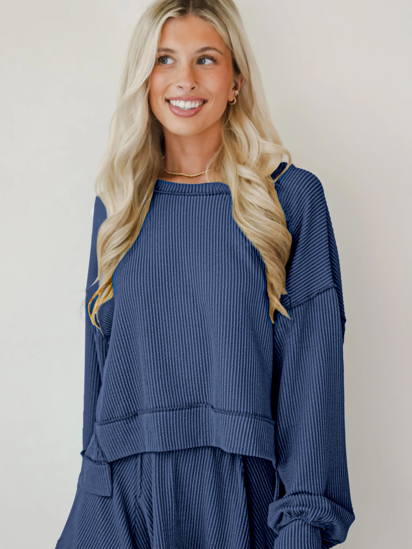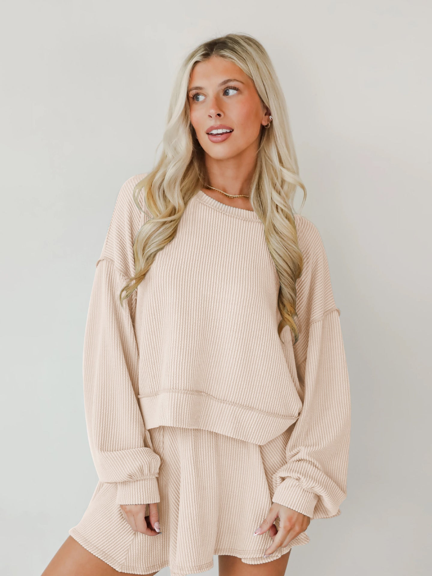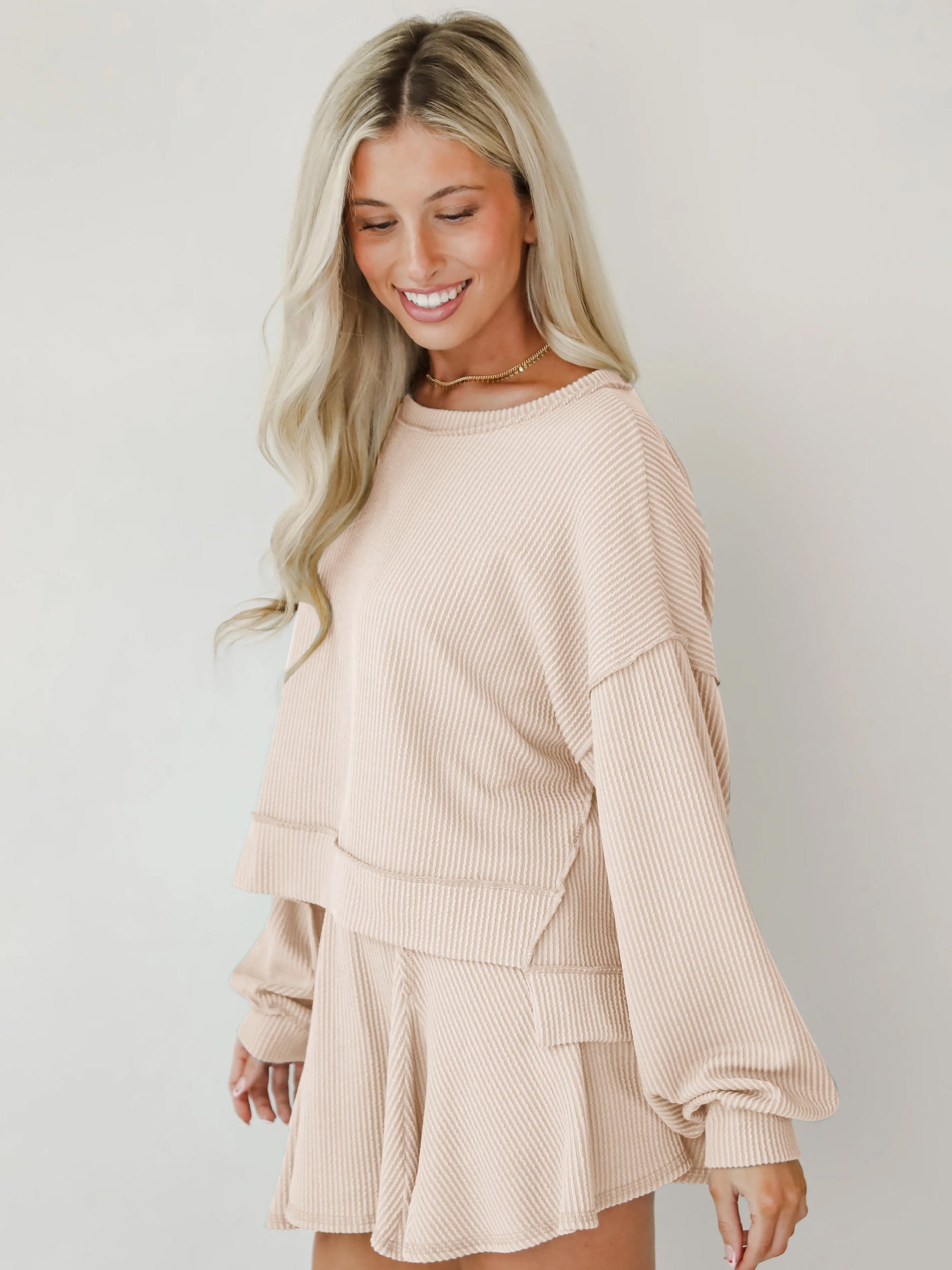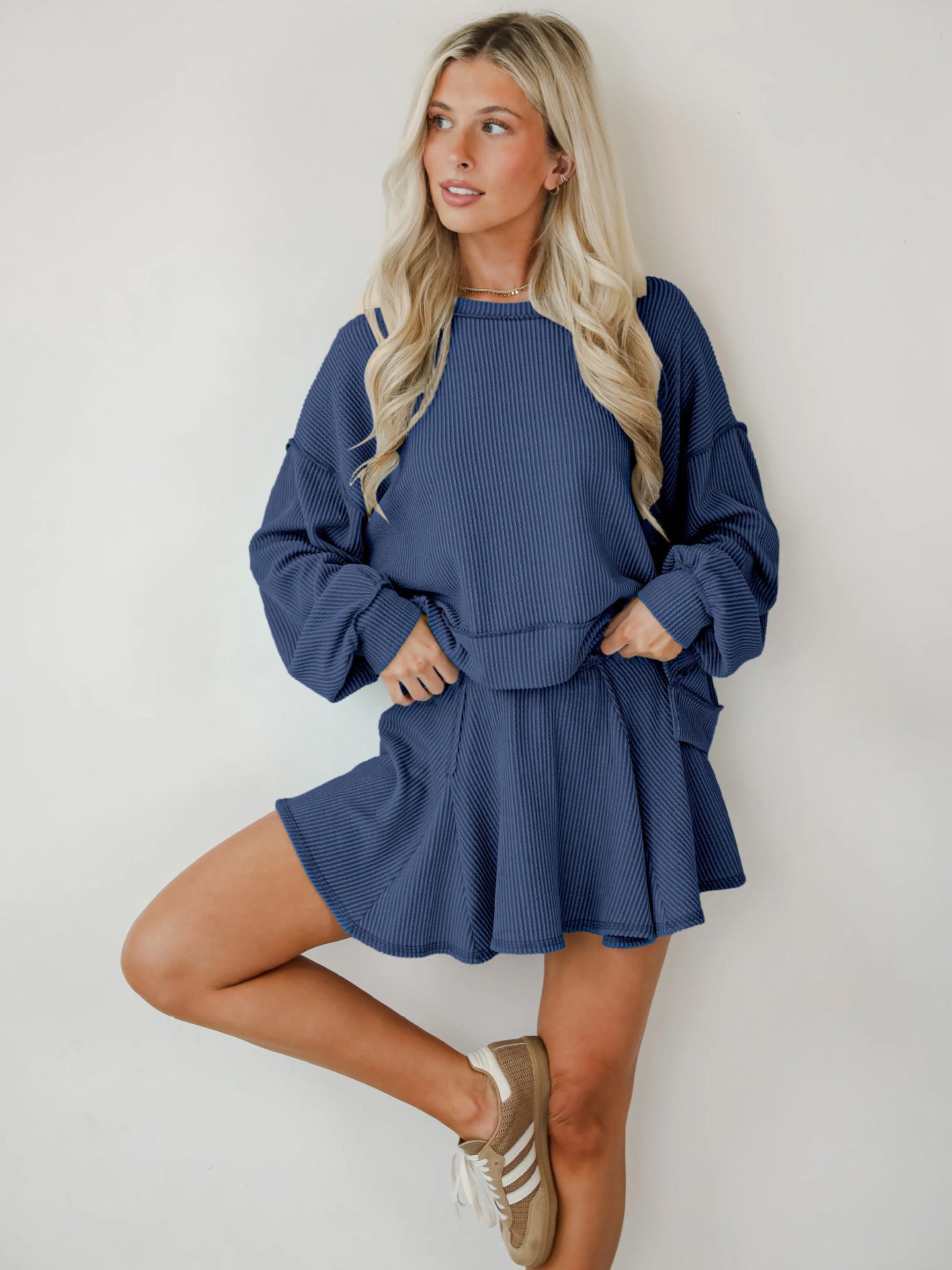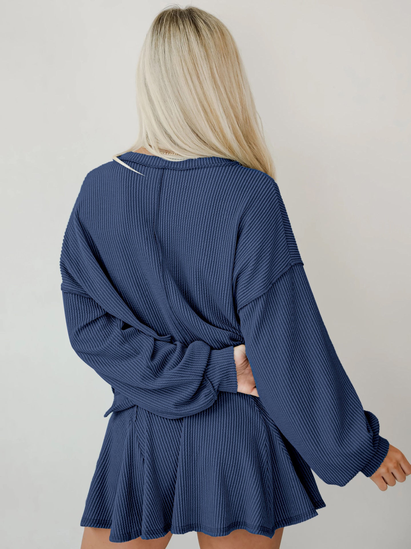 Rock an effortlessly cool vibe with this two-piece set that's giving main character energy. The baggie ribbed top features long cuffed sleeves and an asymmetrical cut—longer in the back for that coveted high-low silhouette—while the crew neckline keeps things casual and chic. Pair it with the matching short skirt for an outfit that's equal parts cozy and fashion-forward. Perfect for anyone who loves oversized comfort without sacrificing style.